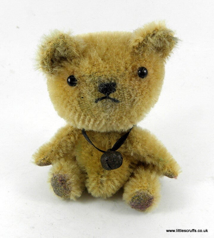 Akira is made from pale gold mohair which I have plucked, shaded and waxed for a well love look. He has black glass eyes and a stitched, waxed nose and mouth and is approximately 3 1/2 inches . He is fully cotter pin jointed and stuffed with kapok, a natural product from the Kapok tree. He has tiny steel discs in his body for added weight and comes with a rusty old bell around his neck.