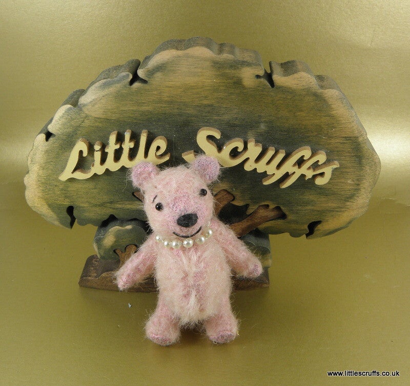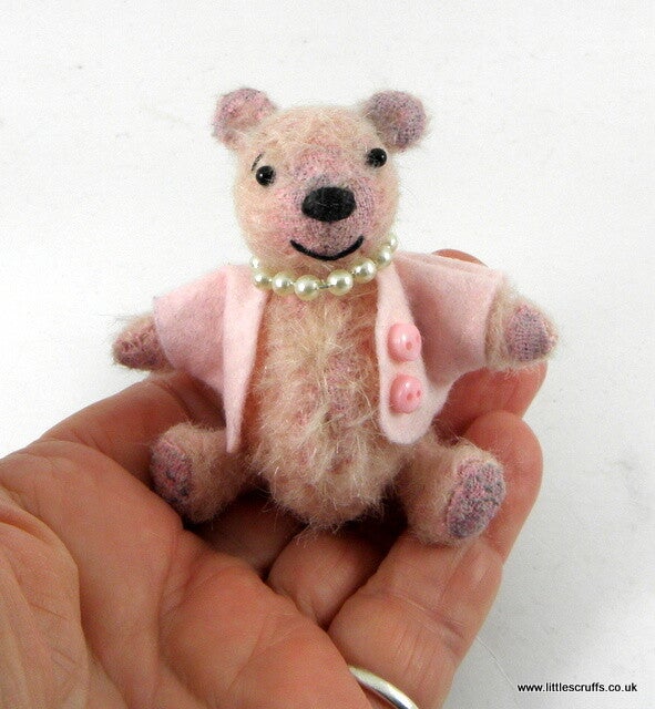 Lady Winnie is made from pink mohair and is approximately 3 inches tall. She has black glass eyes and a stitched, waxed nose and smiley mouth. She is fully cotter pin jointed and is stuffed with kapok. Her big fat tummy is filled with tiny steel discs for a nice heavy feel and she wears a string of pearls (well that's what she calls them!) around her neck.