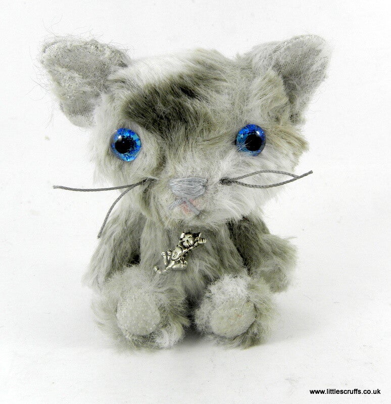 SALE Smokey is a cuddly little cat with two tone fur in grey,brown. This is all I have left of this fabric so he ia a one of a kind. He has gorgeous blue sparkly eyes and a stitched grey nose and mouth with whiskers. Smokey is fully cotter pin jointed and is stuffed with Kapok, a natural product from the Kapok tree. He has tiny steel discs in his body for added weight and comes wearing a Tibetan silver cat charm around his neck.
