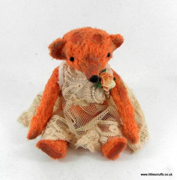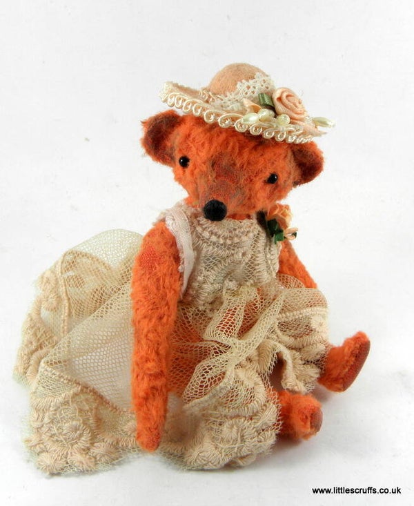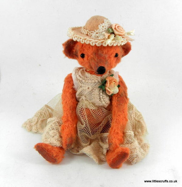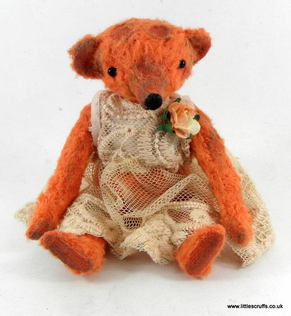 Miss Peachy Barrington is just about 5 inches tall when standing and made from a peach coloured viscose that I have plucked, shaded and waxed for a "well loved"vintage appearance.. She is very prim and proper and wears a handmade vintage lace dress . She has black glass eyes and an embroidered, waxed nose and is fully cotter pin jointed. She is stuffed with Kapox, natural product from the Kapok tree and has tiny steel discs in her body for added weight.