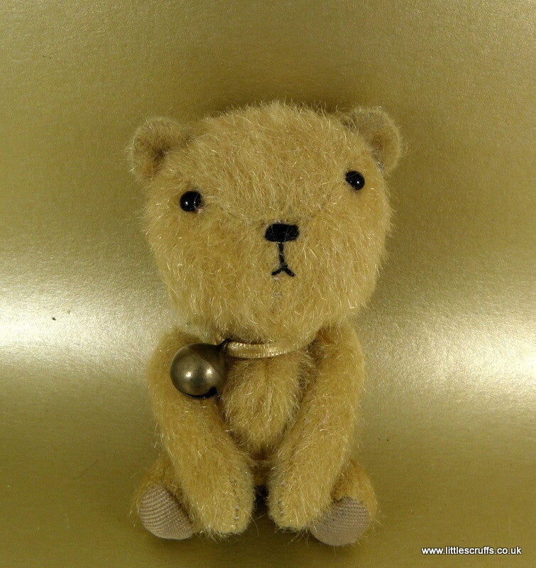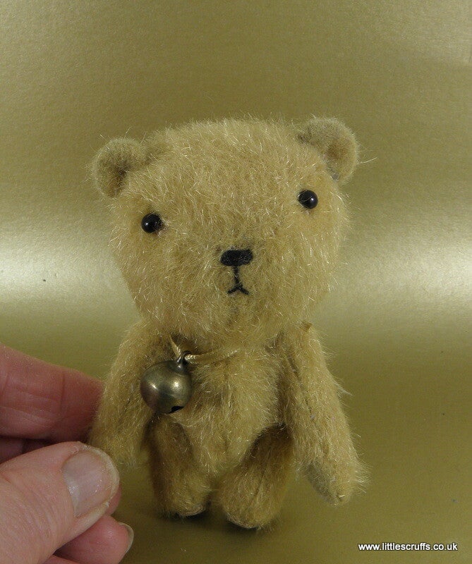Des is approximately 3&3/4 inches from head to toe. He is made from gold miniature bear fabric and has black glass eyes and a roughly stitched nose and mouth He is fully cotter pin jointed and is stuffed with Kapok and has steel shot in his body for added weight.
