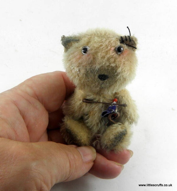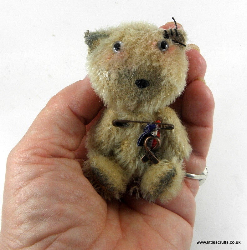 Thomas Bateman was a Private in the infantry during WW1. Gloucester Regiment 10th Battalion. I have named this bear after him. He is made from blonde mohair which I have plucked, shaded, added faux stitches to and waxed. He is fullu cotter pin jointed and is stuffed with Kapok. He has light blue glass eyes and a stitched,waxed nose. He comes wearing a red, white and blue ribbon on a rusty old pin with a copper "Hope" charm around his neck.