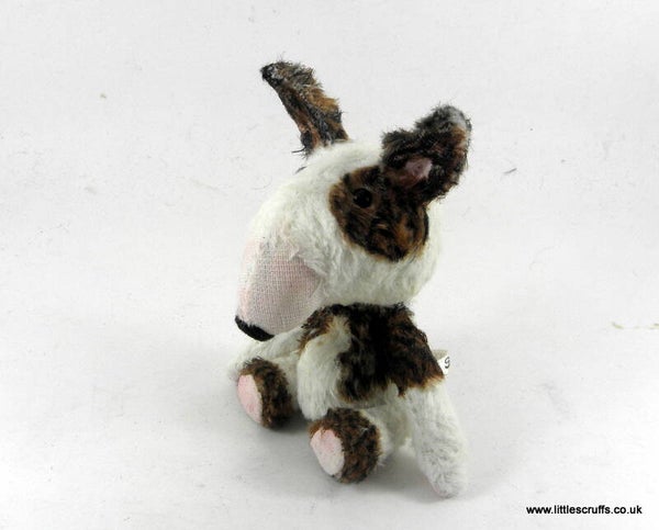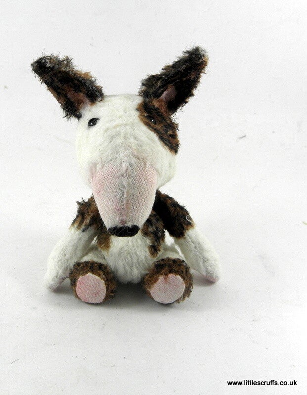 Here we have another brindle and white english bull terrier. He is made from white viscose and hand painted and is approximately 3 & 1/2 inches tall excluding his ears. He has black glass eyes and an embroidered mouth, pale pink paws and and around his nose.