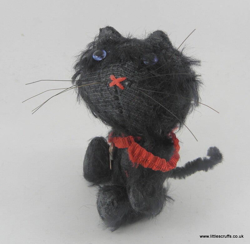 Ambrose is made from black mohair which I have plucked, saded and waxed.He has blue glass eyes and is fully cotter pin jointed. He is stuffed with Kapok and has steel shot in his body for added weight. He comes wearing a tatty red ribbon with a copper coloured "Hope" charmaround his neck.
