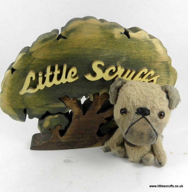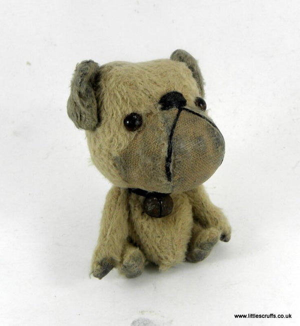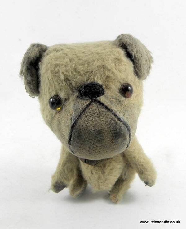 He is approximately 3 inches when standing on his little legs and has a large head with brown glass eyes and an embroidered, waxed nose.