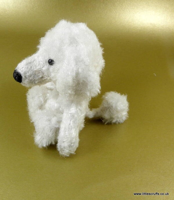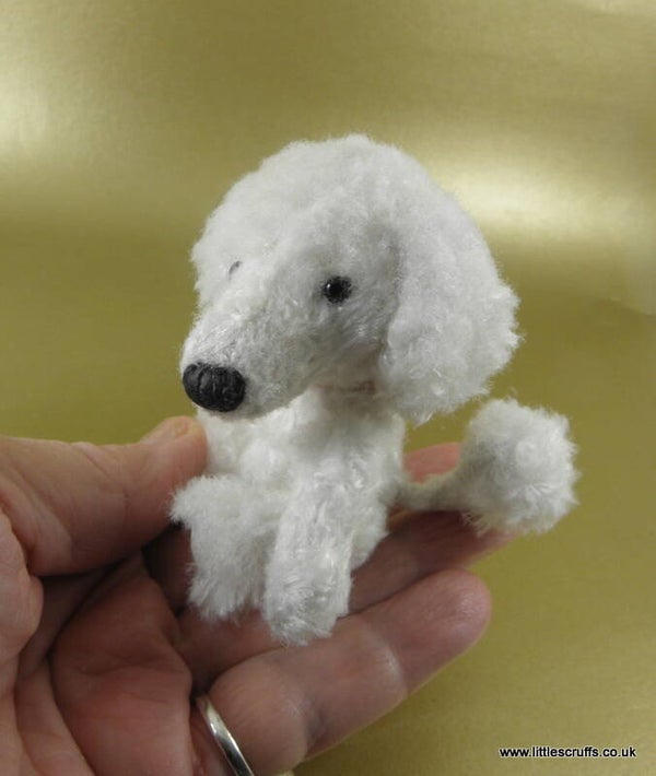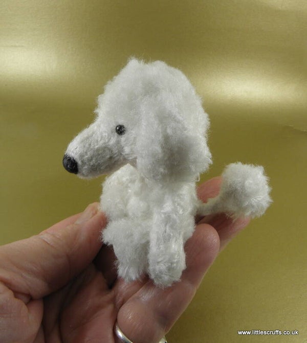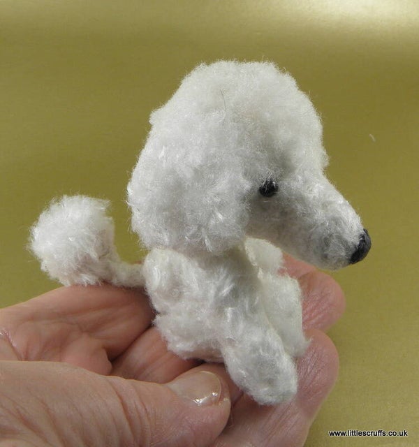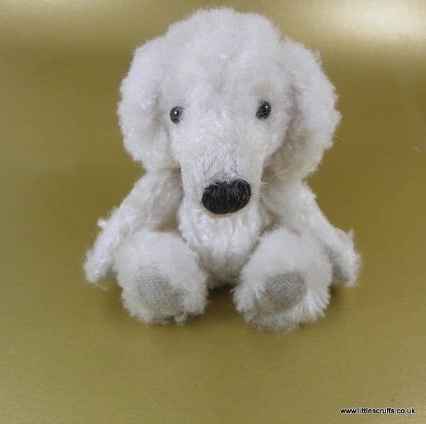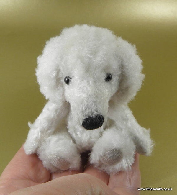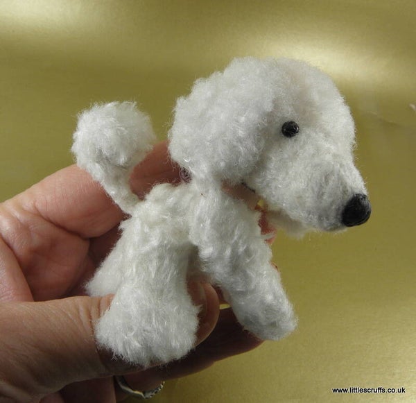Gigi is white and fluffy with a pompom tail. She has black glass eyes and a stitched waxed nose.