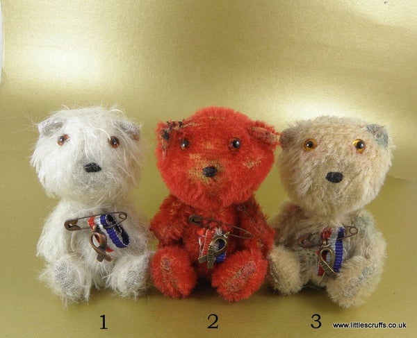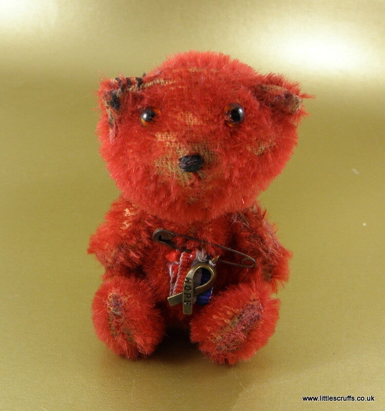 Soldier Bear Bernard is made from red mohair and is fully cotter pin jointed. He has brown glass eyes and a stitched, waxed nose and is stuffed with Kapok. He has steel shot in his body for added weight and I have plucked, shaded and waxed him to look "well loved" He wears a red/white/blue ribbon with a "Hope" charm attached by a rusty old pin.