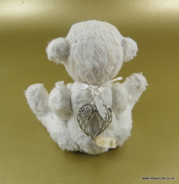 This little one is made from white viscose with light pink shading to her face and paws. She comes wearing a Tibetan silver Angel around her neck and Silver wings on her back. She has black glass eyes and an embroidered, waxed nose and is fully cotter pin jointed.