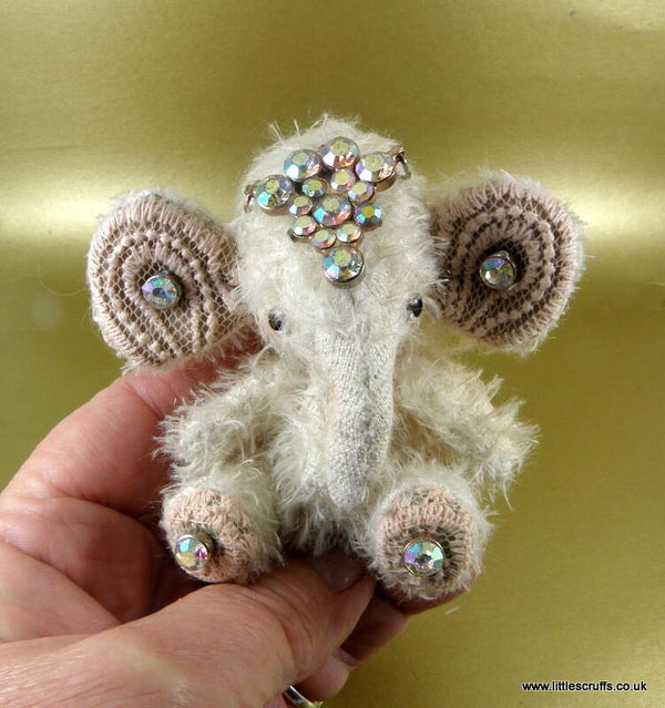Elsa is approximately 3 & a half inches tall and made from white mohair with pretty pink lace paws and ears and sparkling jewels.