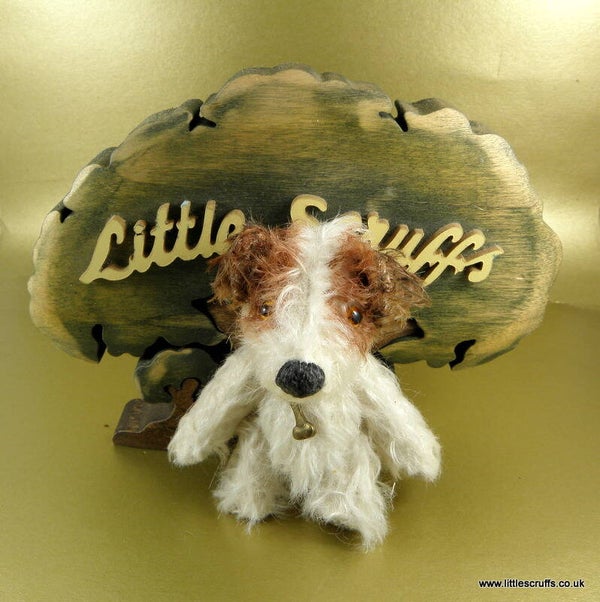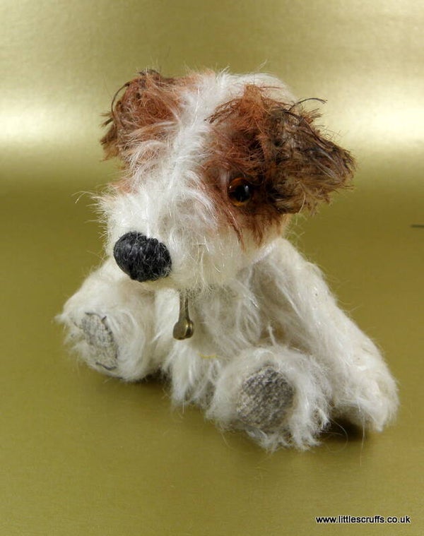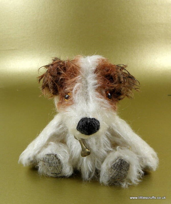 River is fully cotter pin jointed and stuffed with Kapok, with steel shot in his body for added weight. He comes wearing a dog bone on white ribbon around his neck.