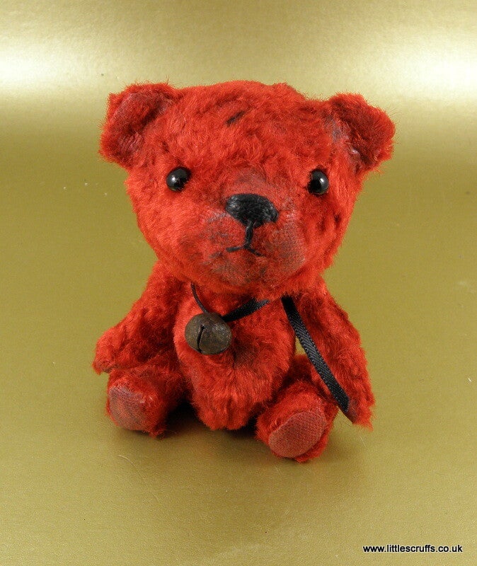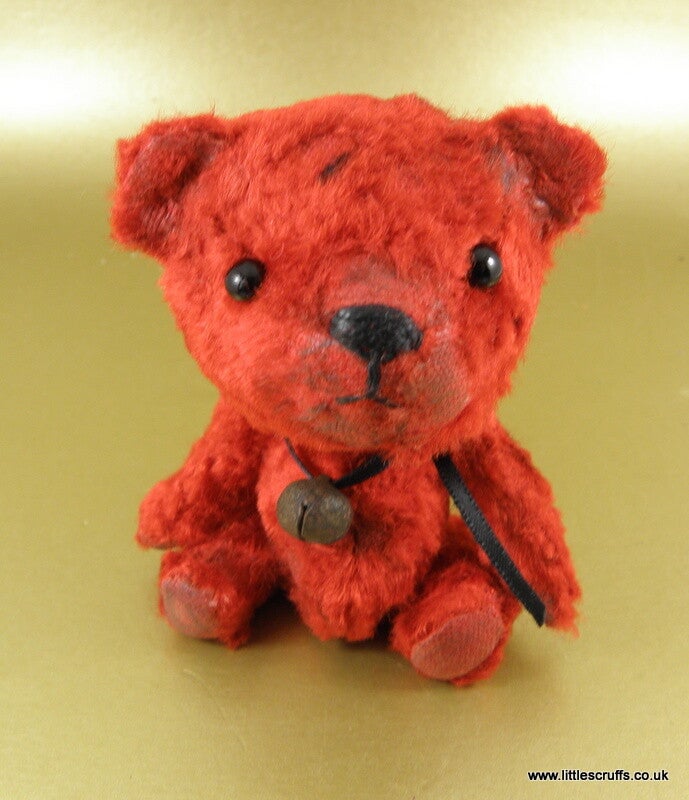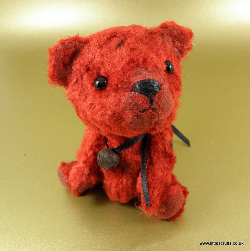 Toto is just over 3 & a half inches tall and mad from a lovely red fabric which I have plucked, shaded and waxed for a 'well loved' look. He has black glass eyes and a stitched, waxed nose and mouth.