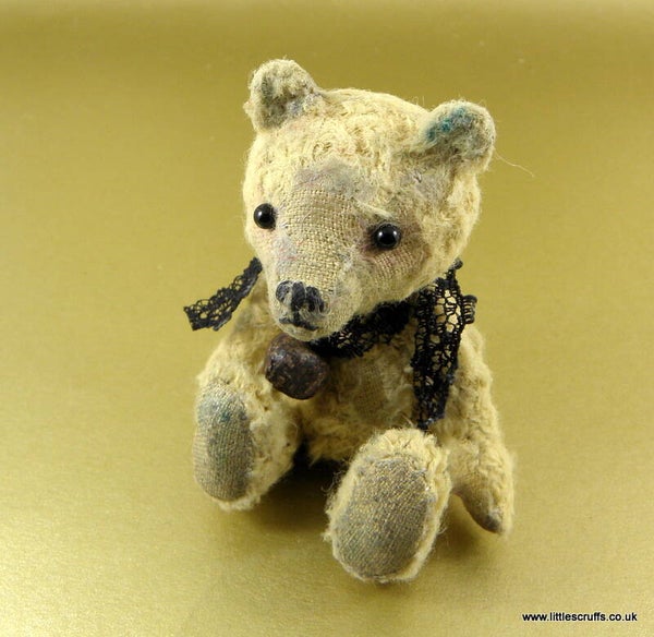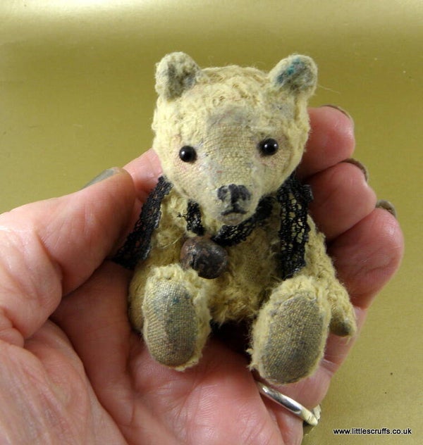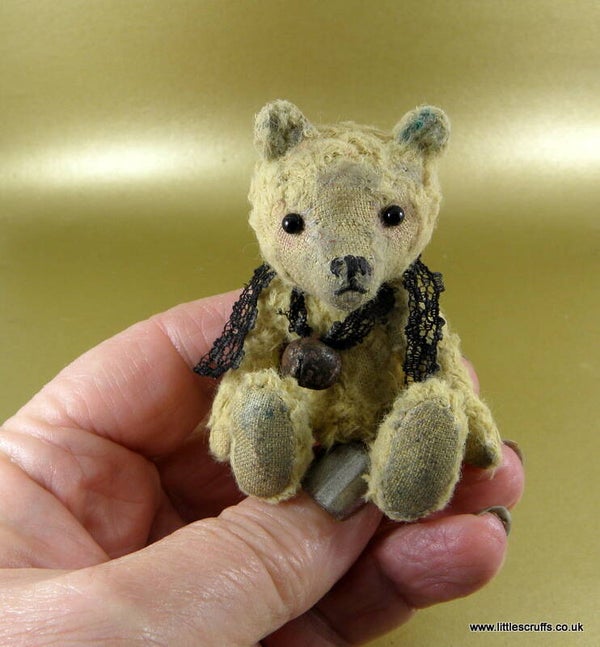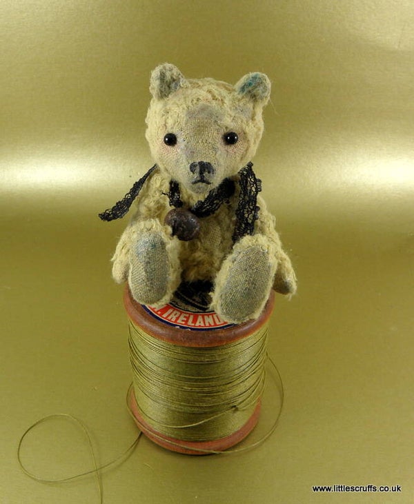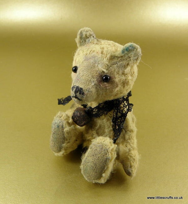 Little Ted is made from beige viscose which I have plucked, shaded and waxed for a "well loved" look. He has black glass yes and a worn looking nose and comes wearing a rusty old bell on a piece of vintage lace around his neck.