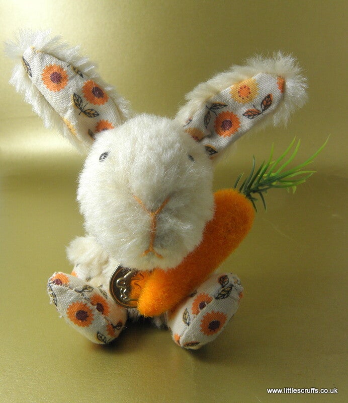 Bunty has black glass eyes and an orange stitched nose and mouth. She is fully cotter pin jointed and is stuffed with Kapok and has steel shot in her body. She wears a gold coloured rabbit charm around her neck and comes with a nice big juicy carrot.