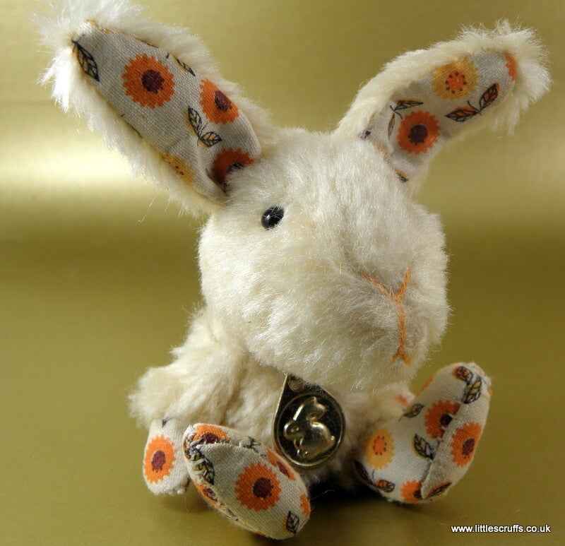 Bunty, a fluffy rabbit with vintage orange flower fabric inner ears and paws