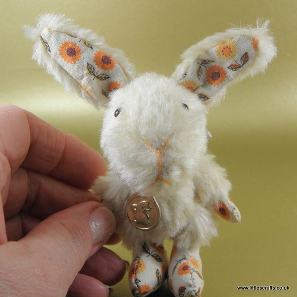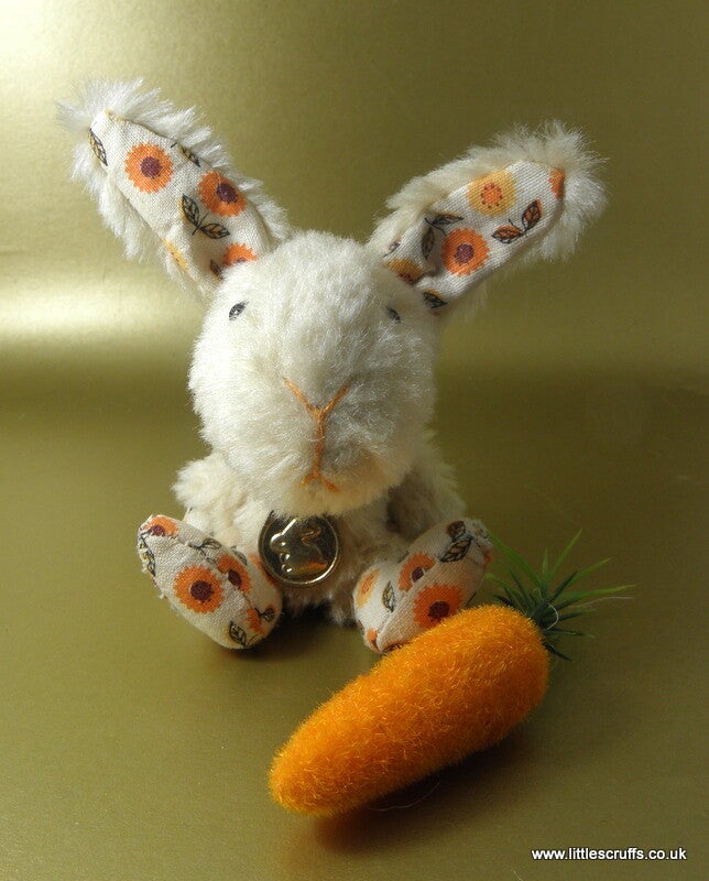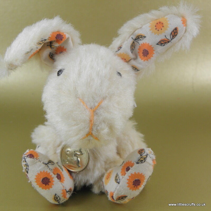 Bunty is a delightful cream rabbit with vintageorange flowed cottan fabricfor her inner ears, hands and feet. She is approximately 3 & 1/2 inches excluding her ears.