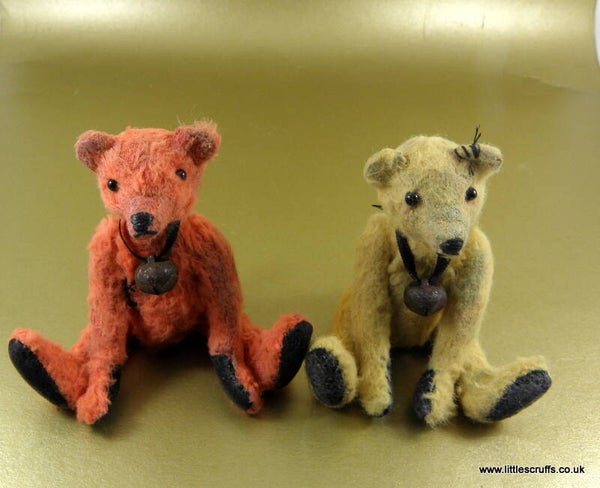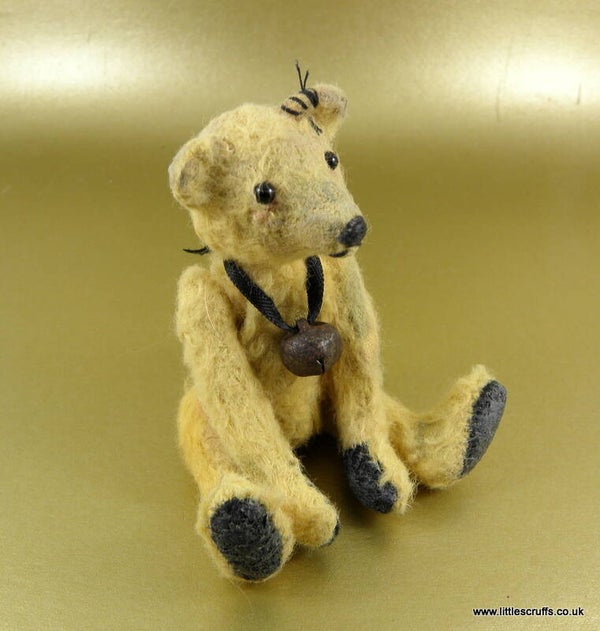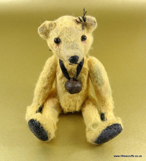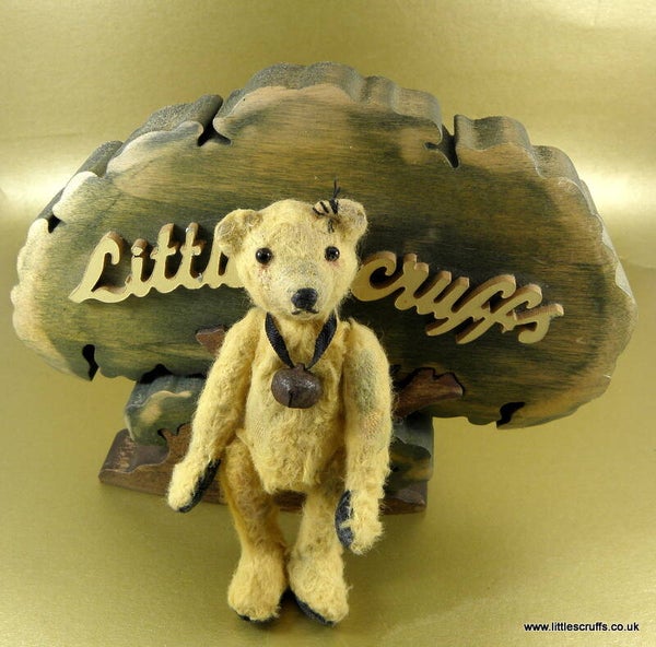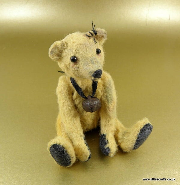 Hugh is approximately 3 & 3/4"and has black glass eyes and a stitched, waxed nose and mouth. He is made from pale gold viscose which I have plucked, shaded, waxed and added faux stitches to for an old well loved looking bear. He has black felt waxed paws and is stuffed with Kapok. He has steel shot in his body for added weight and is fully cotter pin jointed.