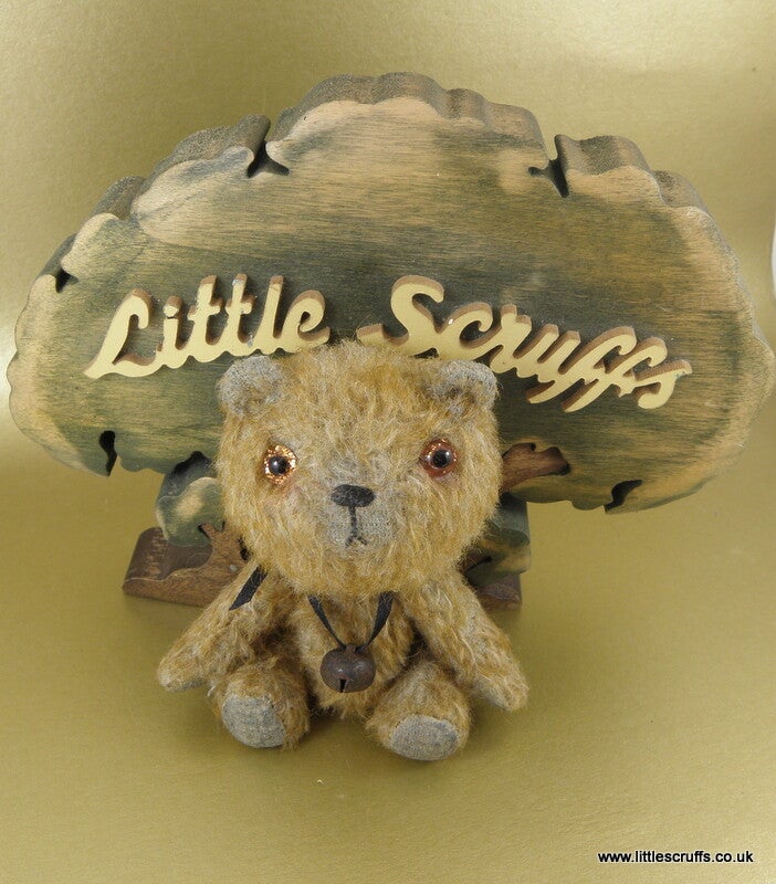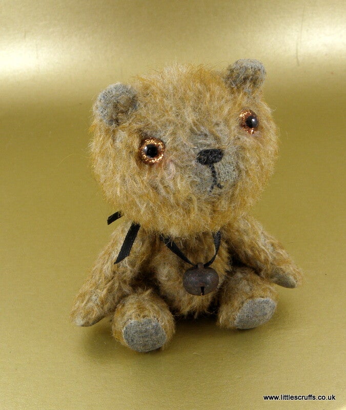 Levi is 3 & 1/2 inches tall and made from a two tone mohair. He has lovely unusual sparkling brown/gold glass eyes and a stitched, waxed nose and tiny mouth. He is fully cotter pin jointed and is stuffed with Kapok, with steel shot in his body for added weight.