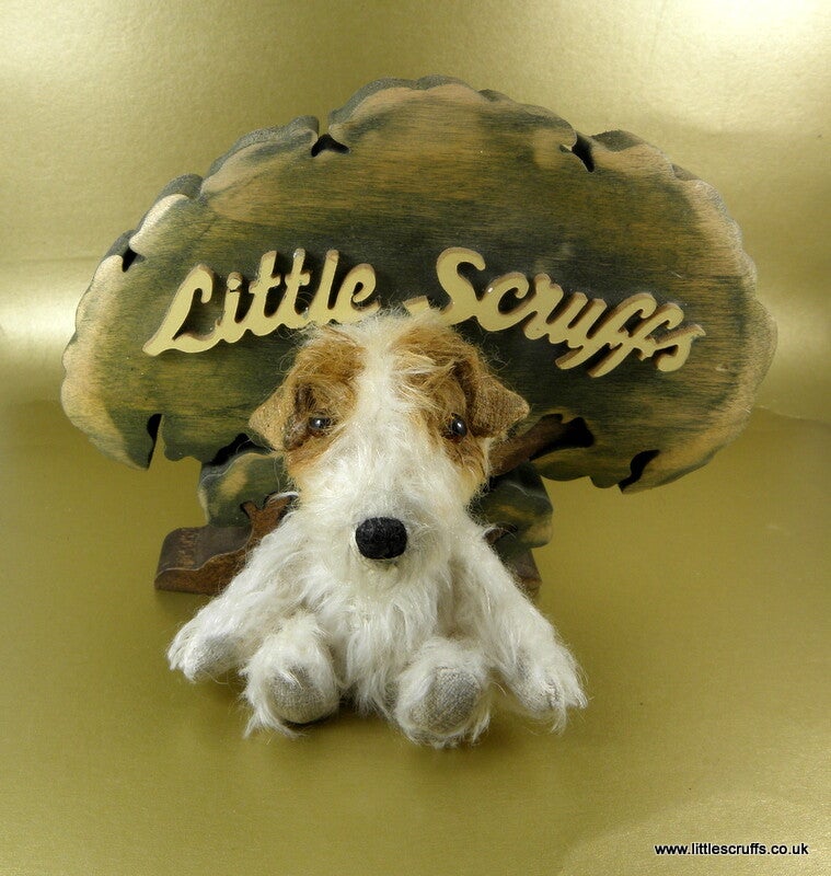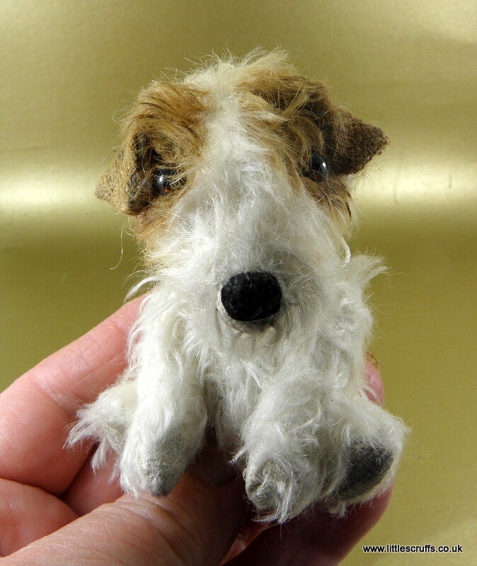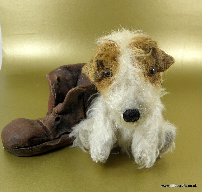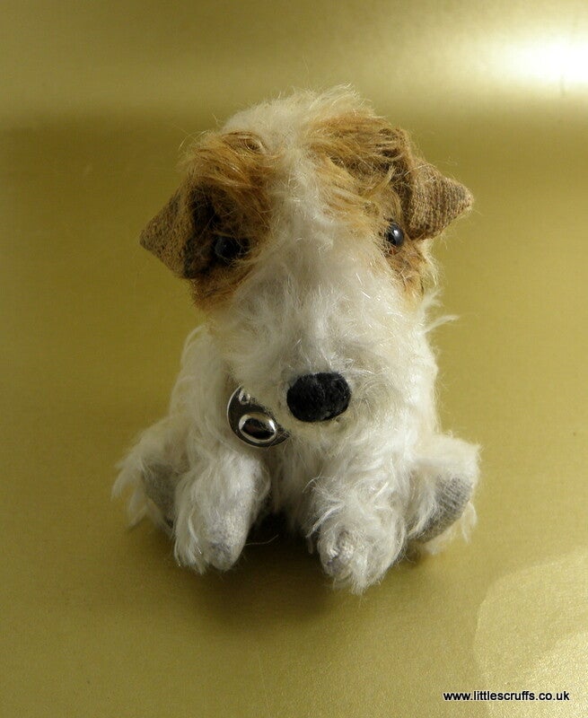 Rolo is just under 3 & half inches tall and is fully cotter pin jointed. He is stuffed with Kapok and has steelshot in his body for added weight. He wears a paw print charm around his neck .