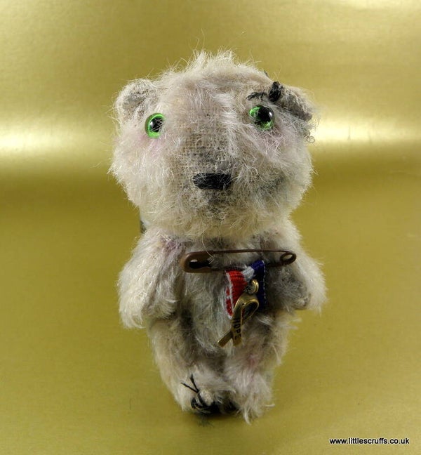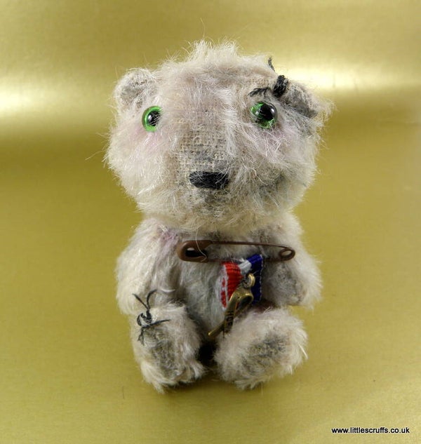 Frederick is made from cream mohair which I have plucked, shaded,waxed and added faux stitches to for a well worn bear. He has green glass eyes and a stitched nose and is fully cotter pin jointed. He is stuffed with Kapok and has steel shot in his body for added weight.