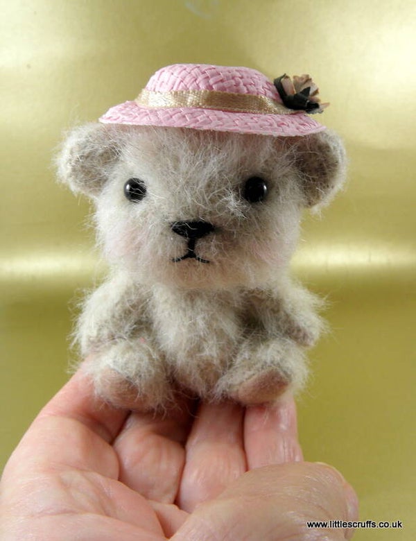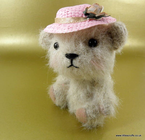 This sweet little cutie is made from cream, part Llama, part mohair, if my memory serves me right. She is 3 & 1/2 inches tall and has black glass eyes and an embroidered nose and mouth. She is fully cotter pin jointed and is stuffed with Kapok, with tiny steel pieces in her body for added weight. I have given her slightly rosey cheeks and a pink hat with a tiny flower attached.
