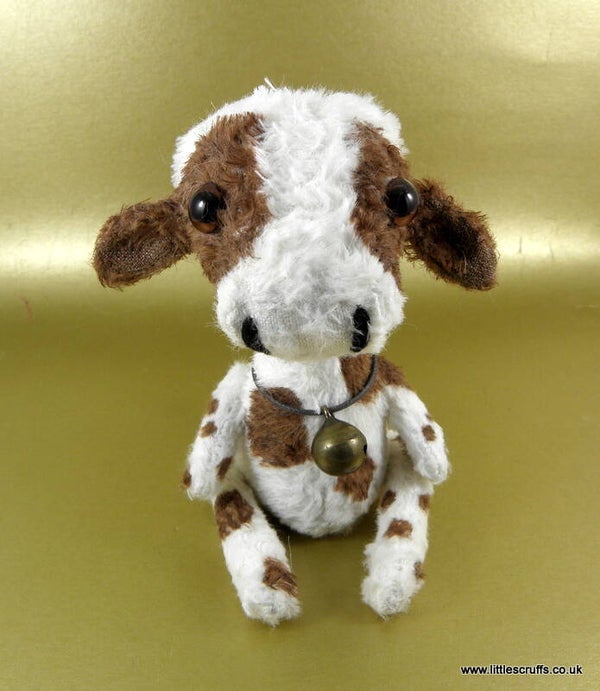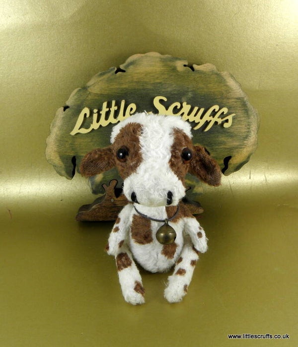Clarabelle is made from white viscose and hand painted with brown markings. She is approximately 5 inches tall. She has big soulful handpainted brown glass eyes and stitched nostrels.