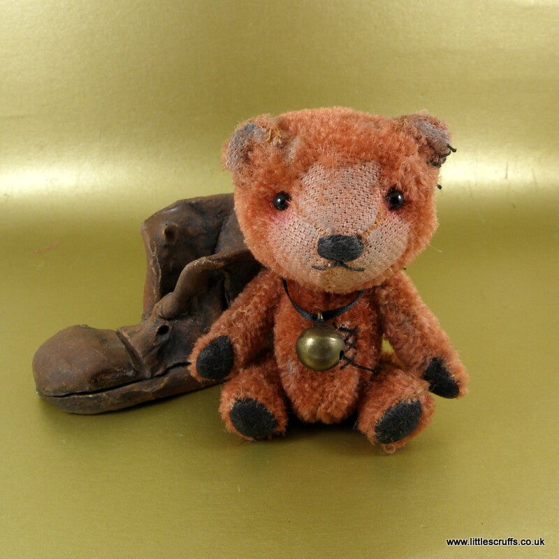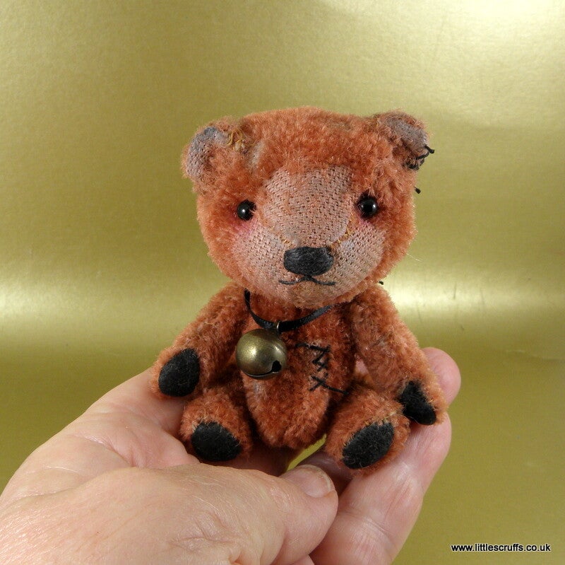 Bruce is approximately 3 & 1/2 inches when standing and is made from antique mohair which I have hand dyed. He has black suede paws treated to look like leather, black glass eyes and an embroidered, waxed nose and mouth. He is fully cotter pin jointed and stuffed with kapok, with steel shot in his body for added weight. I have plucked, shaded and added faux stitching to him for a "well loved" bear.