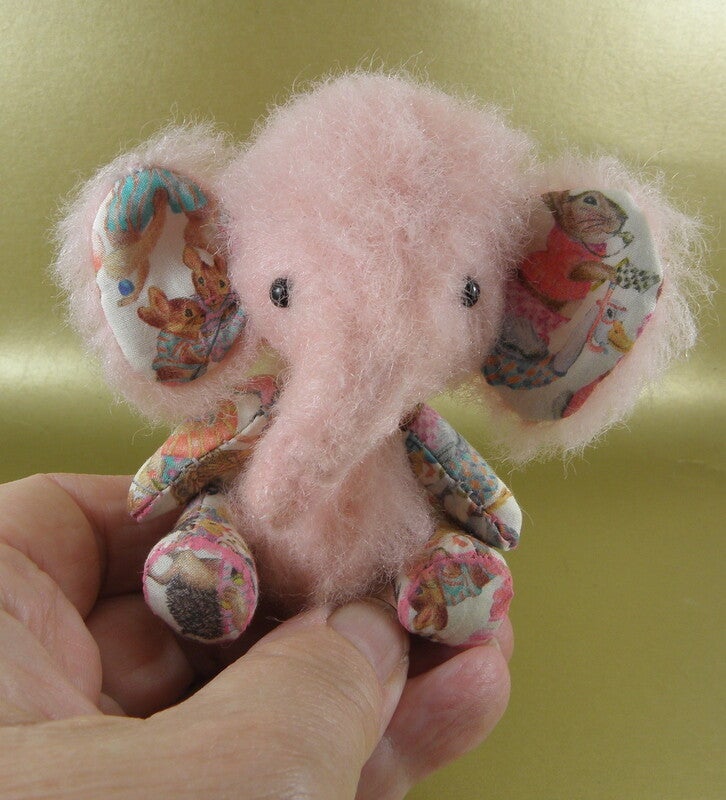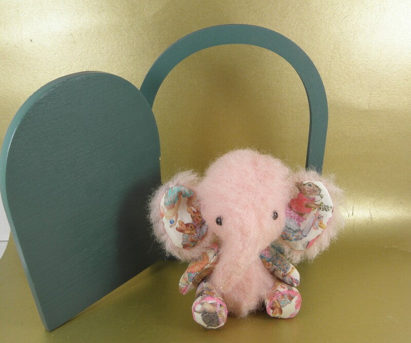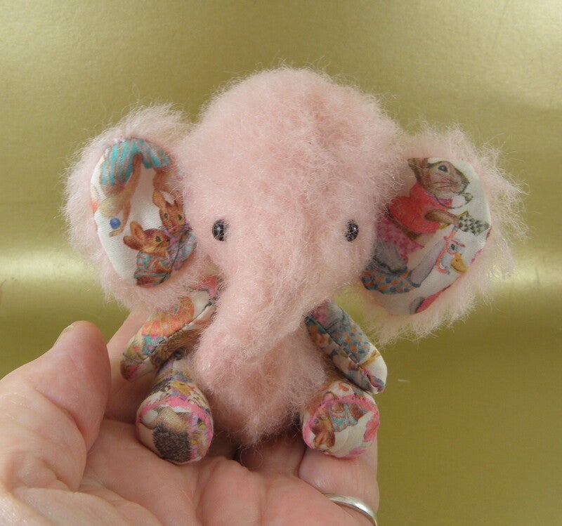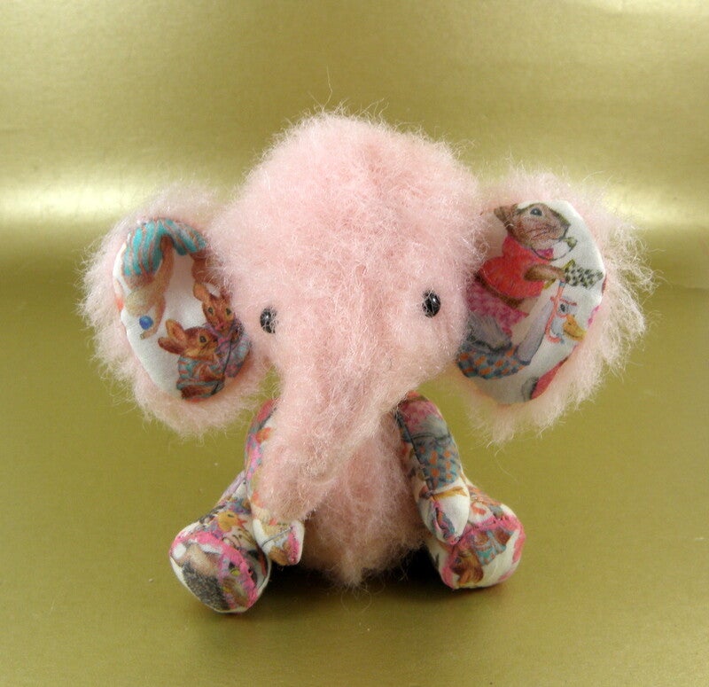 Floss is made from a pink fluffy fabric with beautiful Liberty print inner ears, arms and legs. She has black glass eyes and is fully cotter pin jointed.