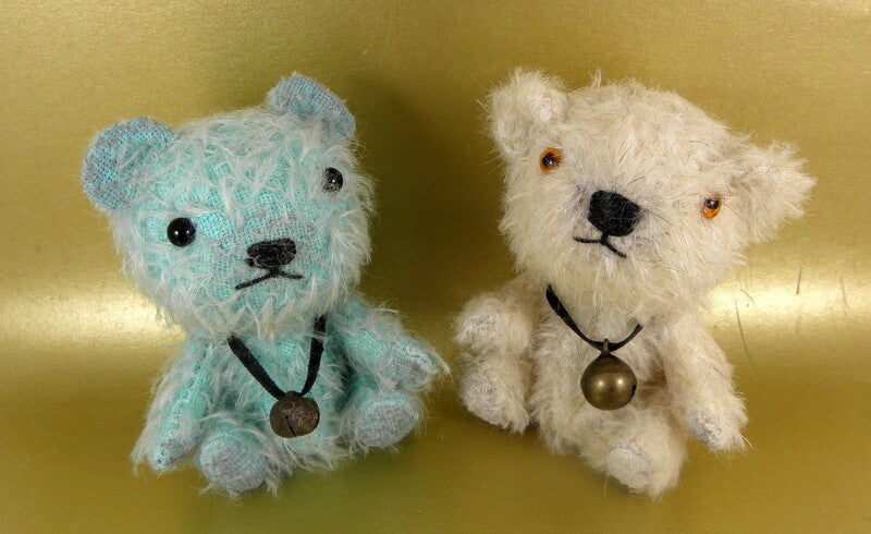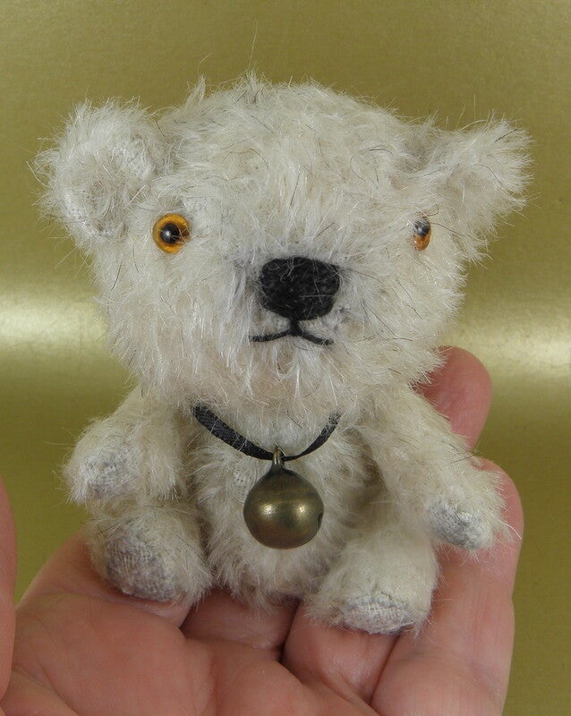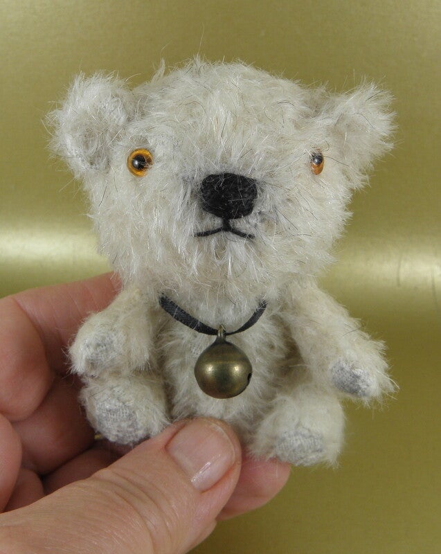This is Merlin. He is made from a lovely off white mohair with a few black guard hairs and has brown glass eyes, a stitched, waxed nose and mouth. He is approximately 3 & 1/4 inches tall.