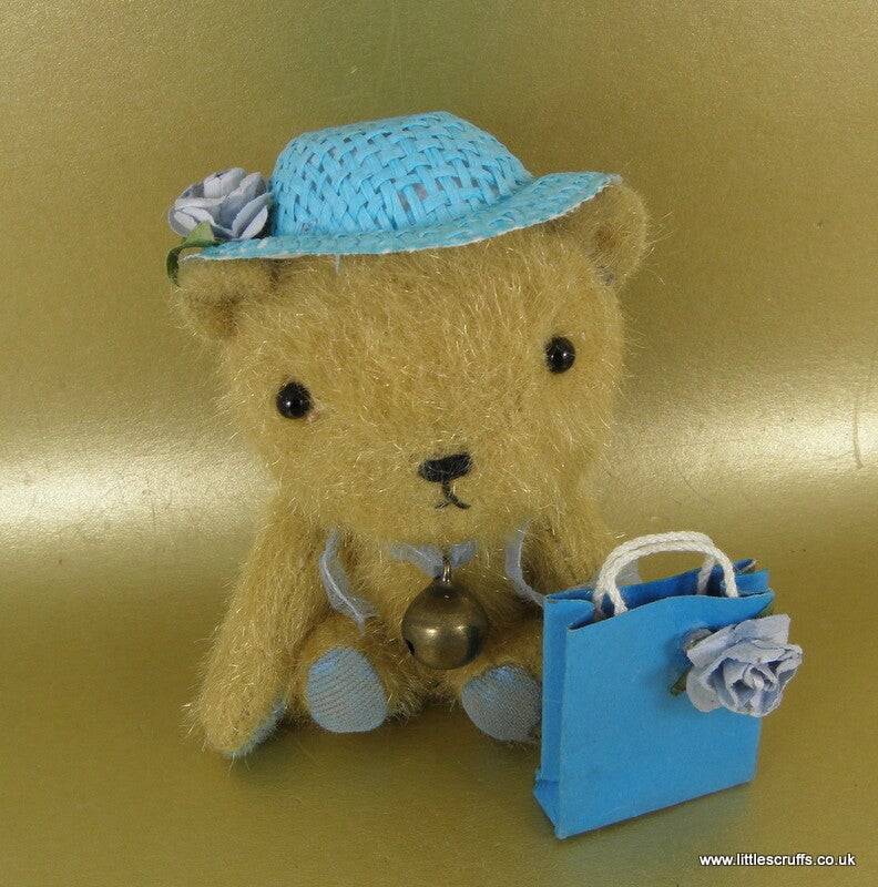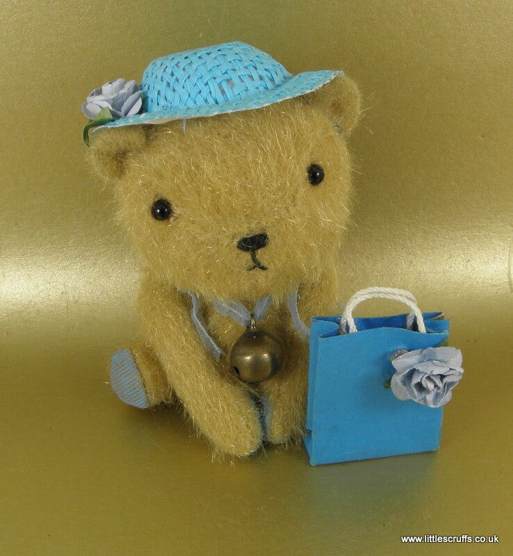 Hattie is approximately 3 & 3/4 inches from head to toe. She is made from gold miniature bear fabric and has black glass eyes and a roughly stitched nose and mouth She is fully cotter pin jointed and is stuffed with Kapok and has steel shot in her body for added weight.
