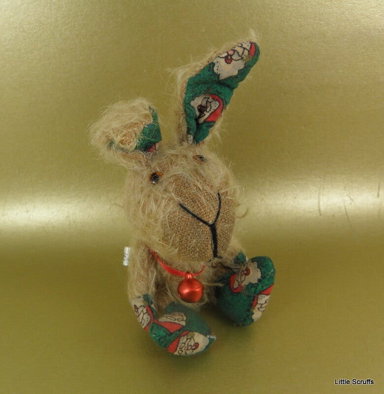 This bunny is made up of 27 pieces of mohair and fabric. The Christmas fabric is 20 years old. He has brown glass eyes and a stitched nose. He is fully cotter pin jointed and stuffed with Kapok, with steel shot in his body for added weight. His inner ears are fabric and outer ears mohair and they are bendable. His paws are fabric with his arms and legs mohair.