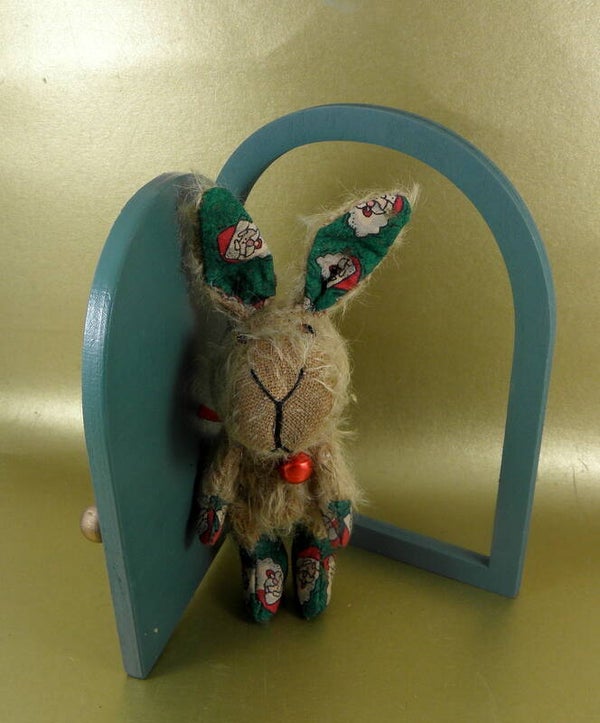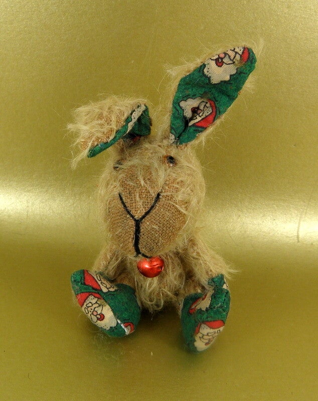 This bunny is made up of 27 pieces of mohair and fabric. The Christmas fabric is 20 years old. He has brown glass eyes and a stitched nose. He is fully cotter pin jointed and stuffed with Kapok, with steel shot in his body for added weight. His inner ears are fabric and outer ears mohair and they are bendable. His paws are fabric with his arms and legs mohair.