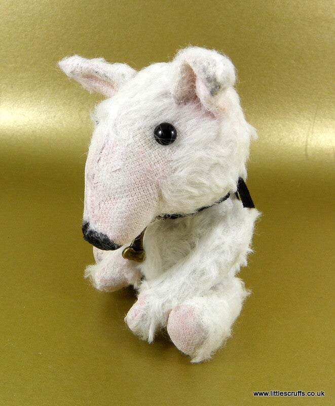 Winston is a white Bull Terrier with pale ink nose, inner ears and paws. If you have an EBT with some black markings I can add them on if you would like. Winston has black glass eyes and an embroidered, waxed nose. He is fully cotterpin jointed and is stuffed with Kapok. He has tiny steel pieces in his body for a nice weight.He wears a bronze coloured dog bone around his neck.