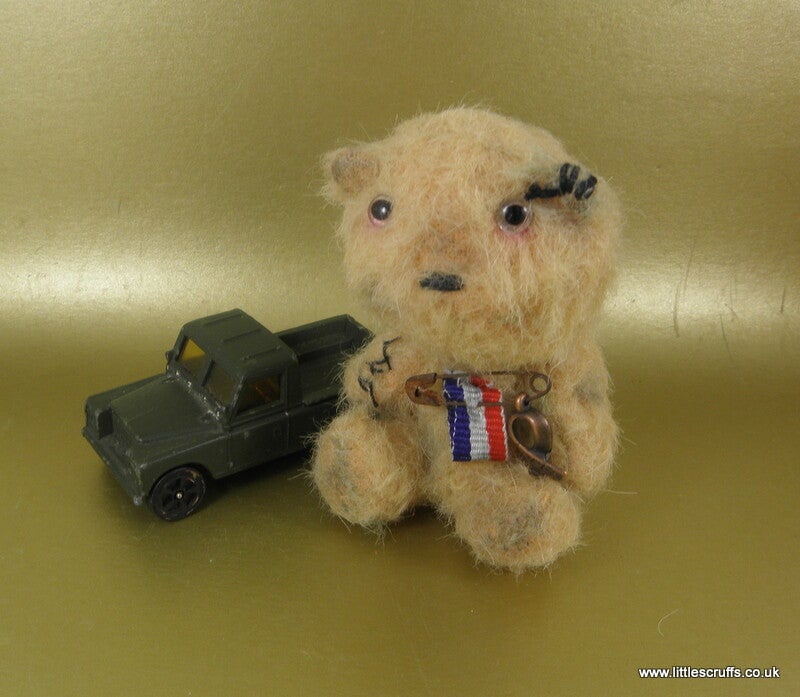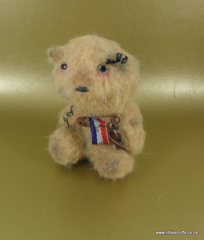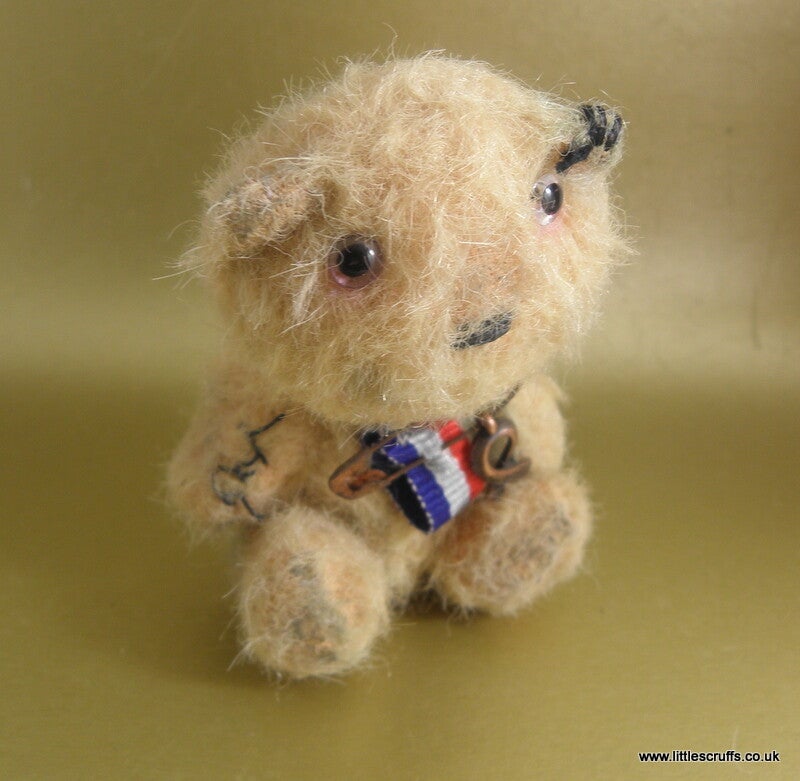 Frank is fully cotter pin jointed and is stuffed with Kapok. He has tiny round pieces of steel in his body for a nice weight. I have plucked, shaded and waxed him and added faux stitches for a well loved look. He wears a bronze coloured "Hope" charm attached to a rusty old safety pin which is on a red, white and blue medal ribbon.