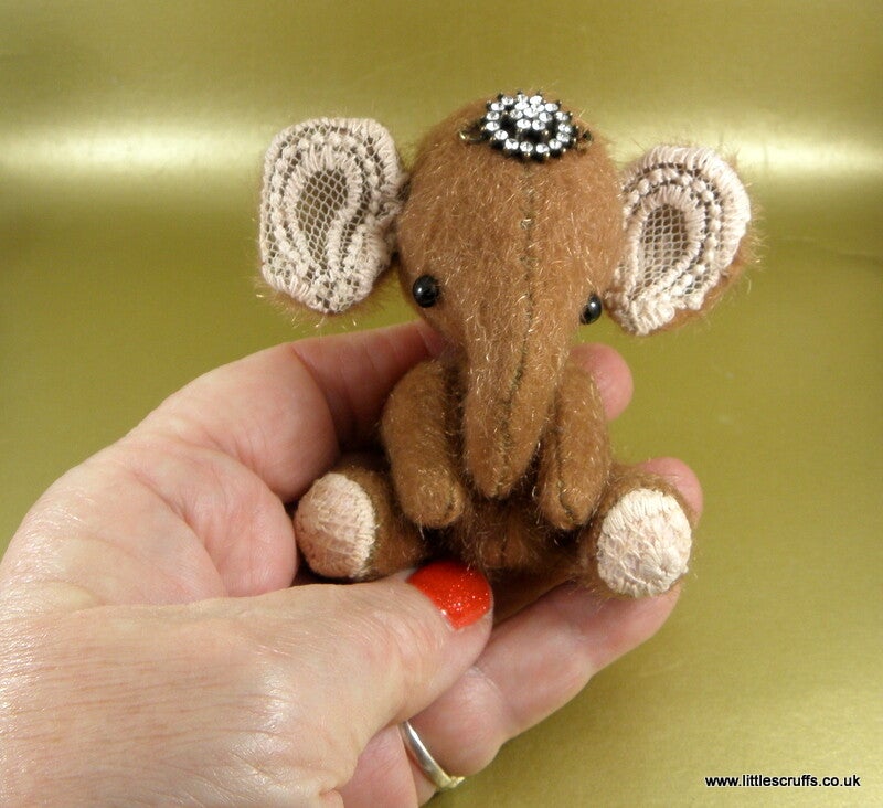This little Elephant is light brown with sparkly fur. She is approximately 3 inches tall and has black glass eyes. Her feet and inner ears are made from pink lace and she has a jewelled adornment on her head. She is fully cotter pin jointed and is stuffed with Kapok and has steel shot in her body for added weight.