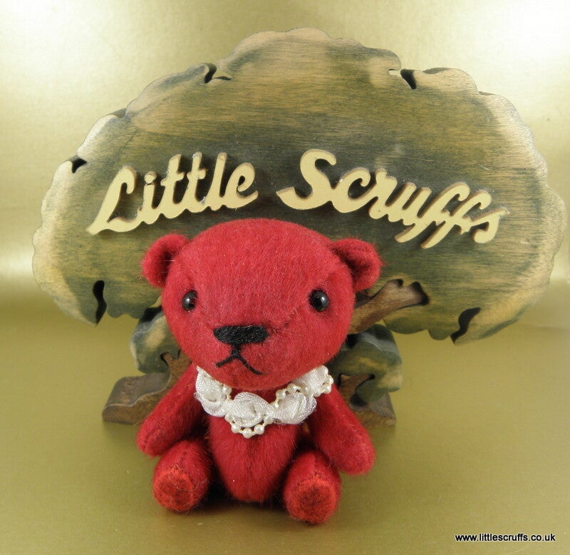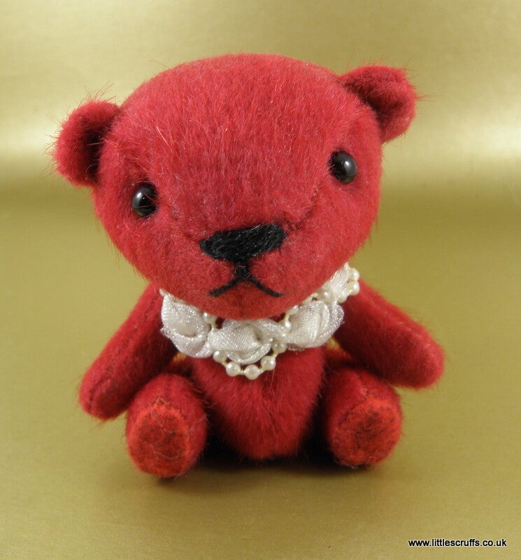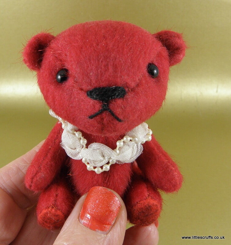 Little red bear Patience is just under 3 &1/2 inches tall and ha black glass eyes and a stitched nose and mouth. She is fully cotter pin jointed and is stuffed with Kapok, with tiny steel circles in her body to give added weight. She wears a pretty pearl entwined fabric around her neck.