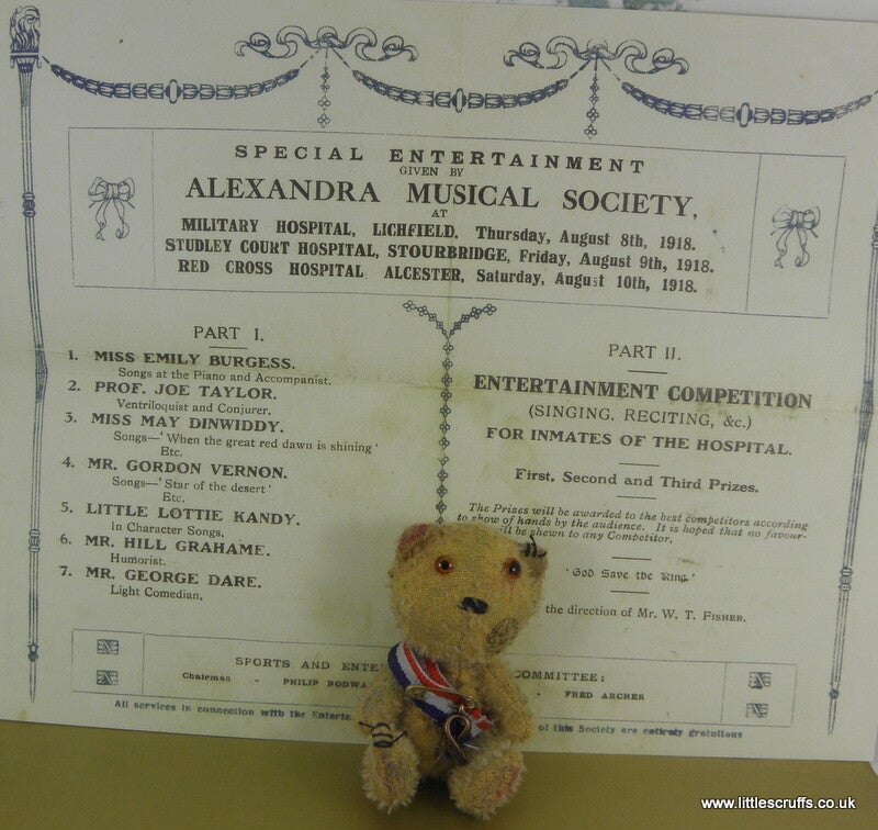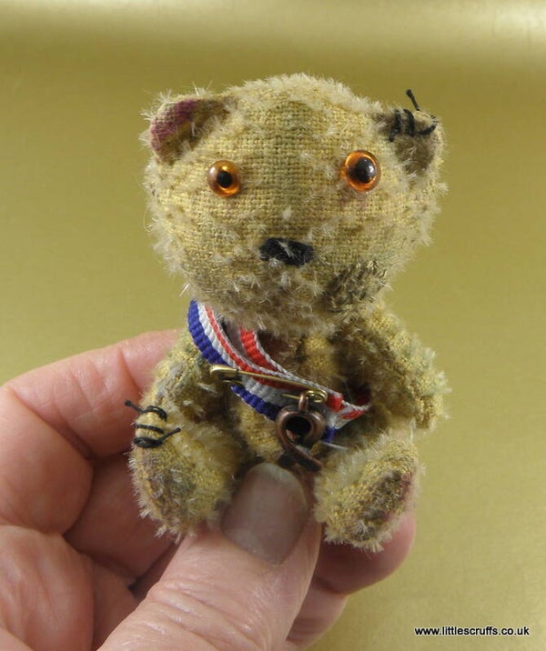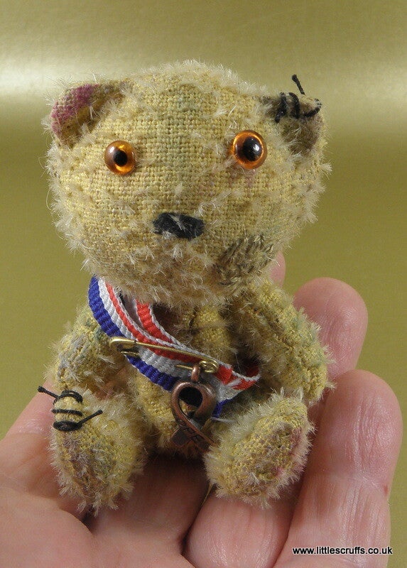 Ernest has brown glass eyes with differnt sized pupils. He is fully cotter pin jointed and is stuffed with Kapok. He has tiny steel pieces in his body for extra weight. He comes wearing a red, white and blue ribbon which has a "Hope" charm attached by a gold safety pin.