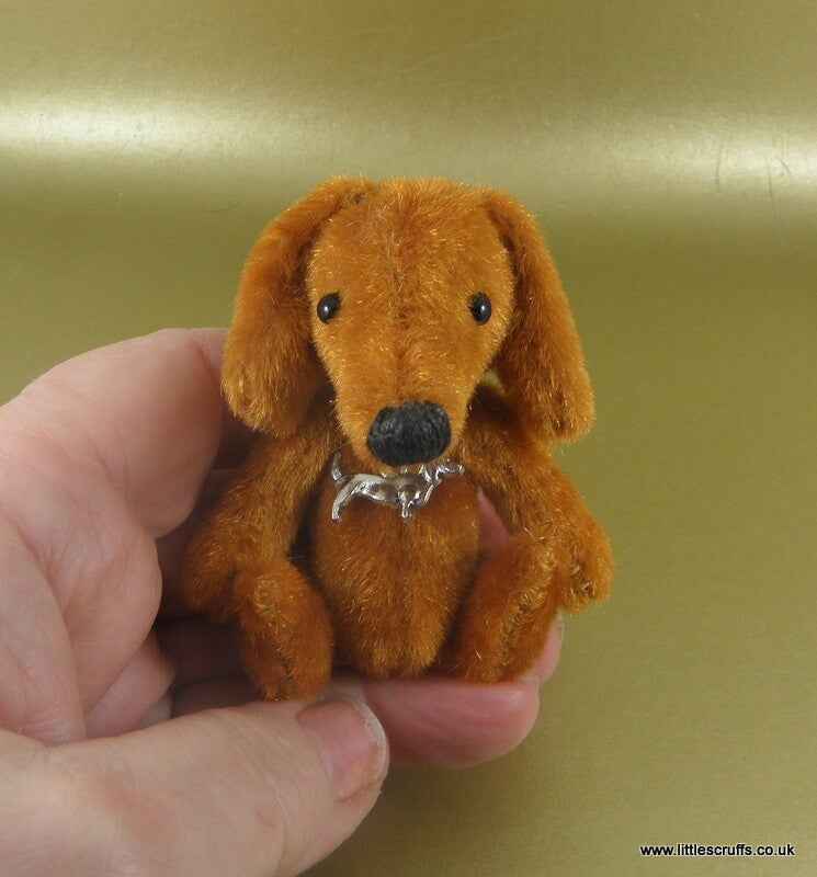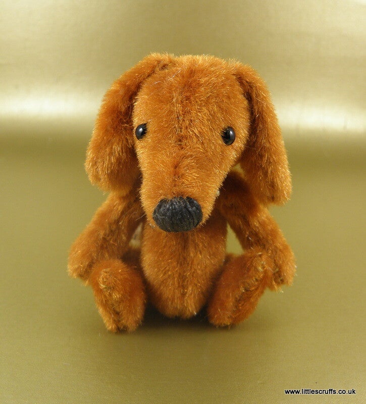 This Dachshund is made from a lovely gold fabric and has black glass eyes and an embroidered, waxed nose. He is fully cotterpin jointed and filled with Kapok and has tiny steel pieces in his body for added weight.