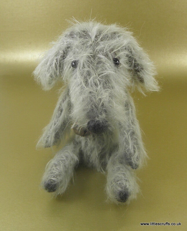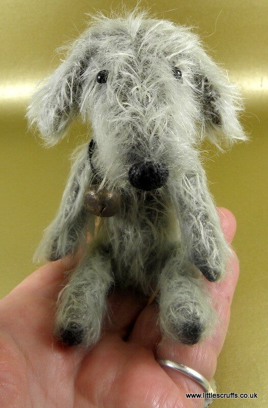 This Deerhound/lurcher is approximately 5 & 1/2 inches tall and is made from grey mohair. He has black glass eyes and an embroidered, waxed nose with a really sweet face. He is 5 way cotter pin jointed and is stuffed with Kapok, he has tiny steel discs in his tummy for added weight. He comes with a jingly bell around his neck.