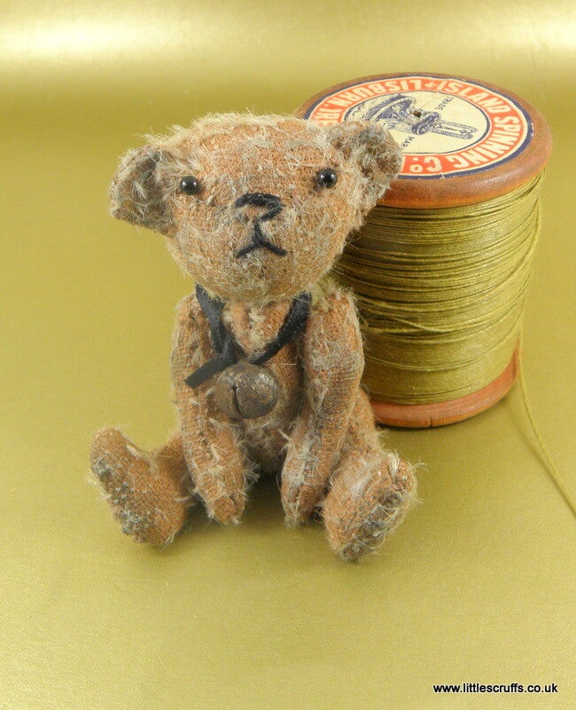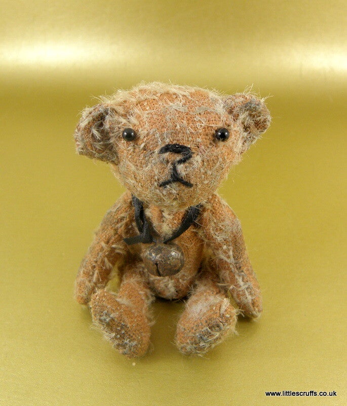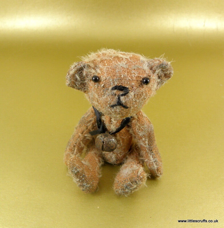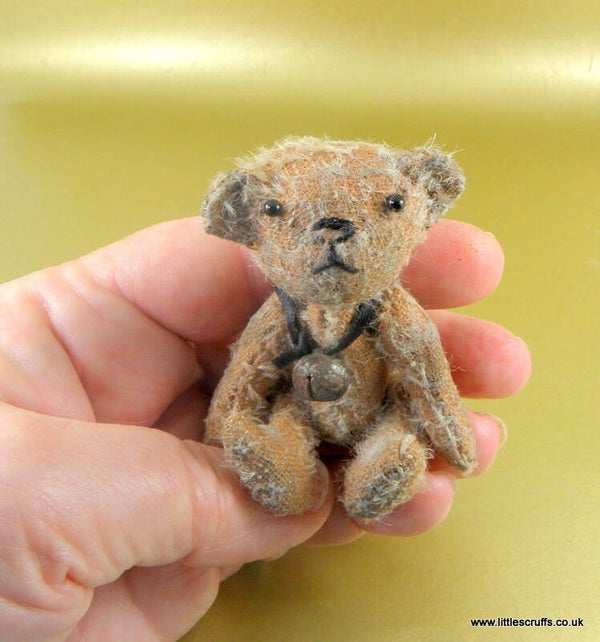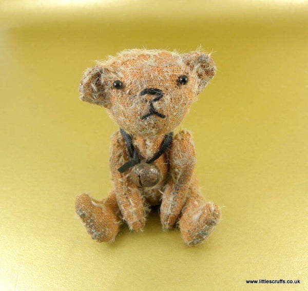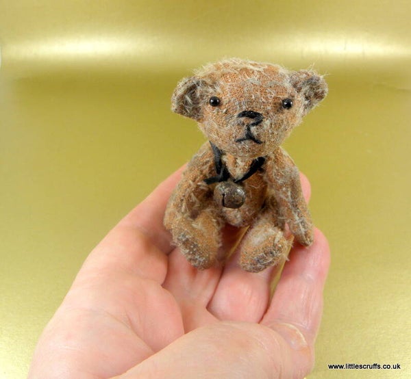 Margo is approximately 3 & 3/4 inches tall and made from sparse mohair which I have further plucked , shaded and waxed for a worn looking old bear.