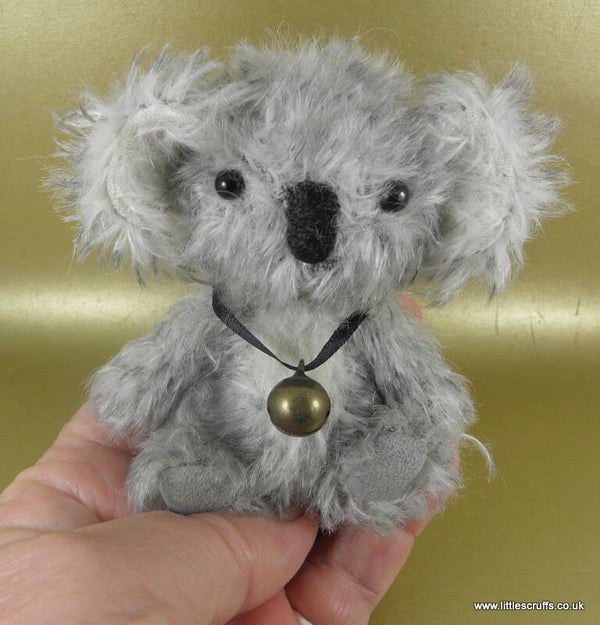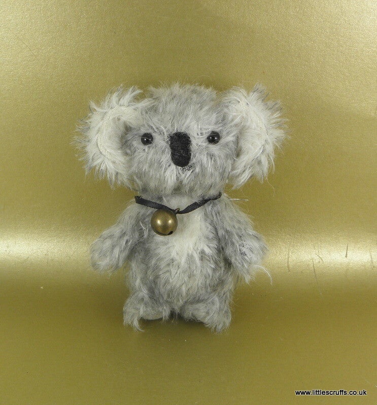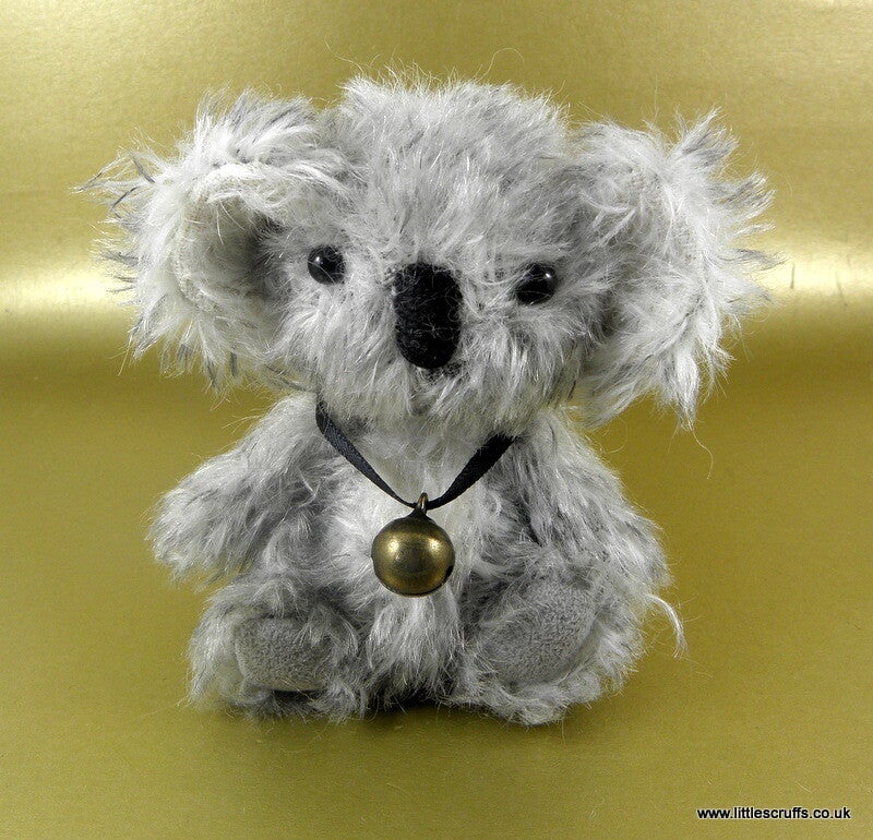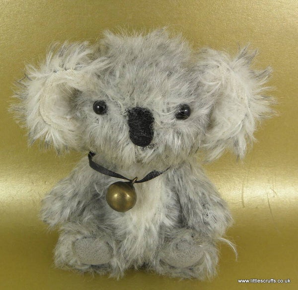 Bindi is a very sweet scruffy mohair Koala bear. She is grey with inner white ears and upper body. Fully cotter pin jointed and stuffed with Kapok. Bindi has a stitched, waxed nose and black glass eyes. She wears a little bell around her neck.